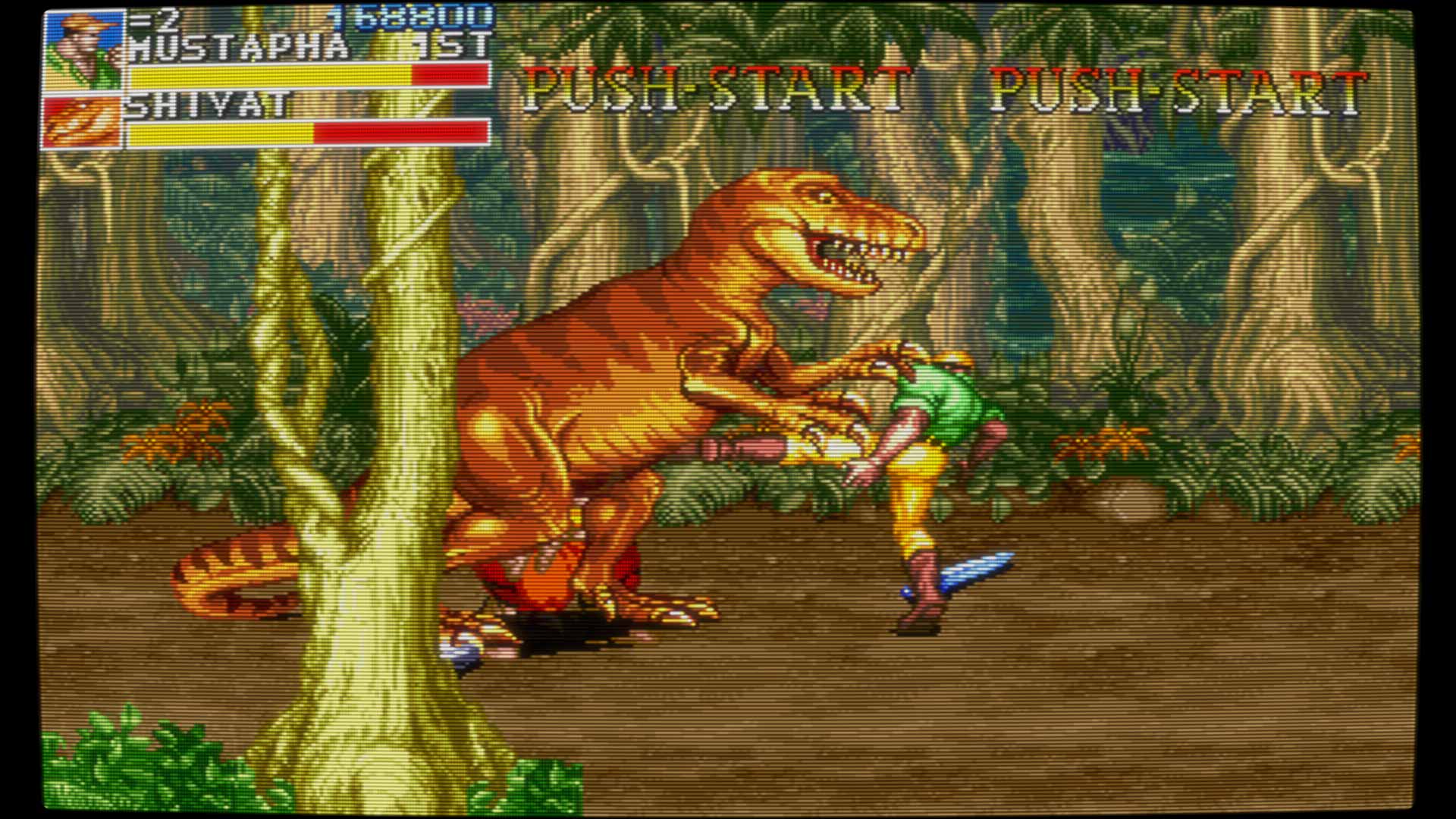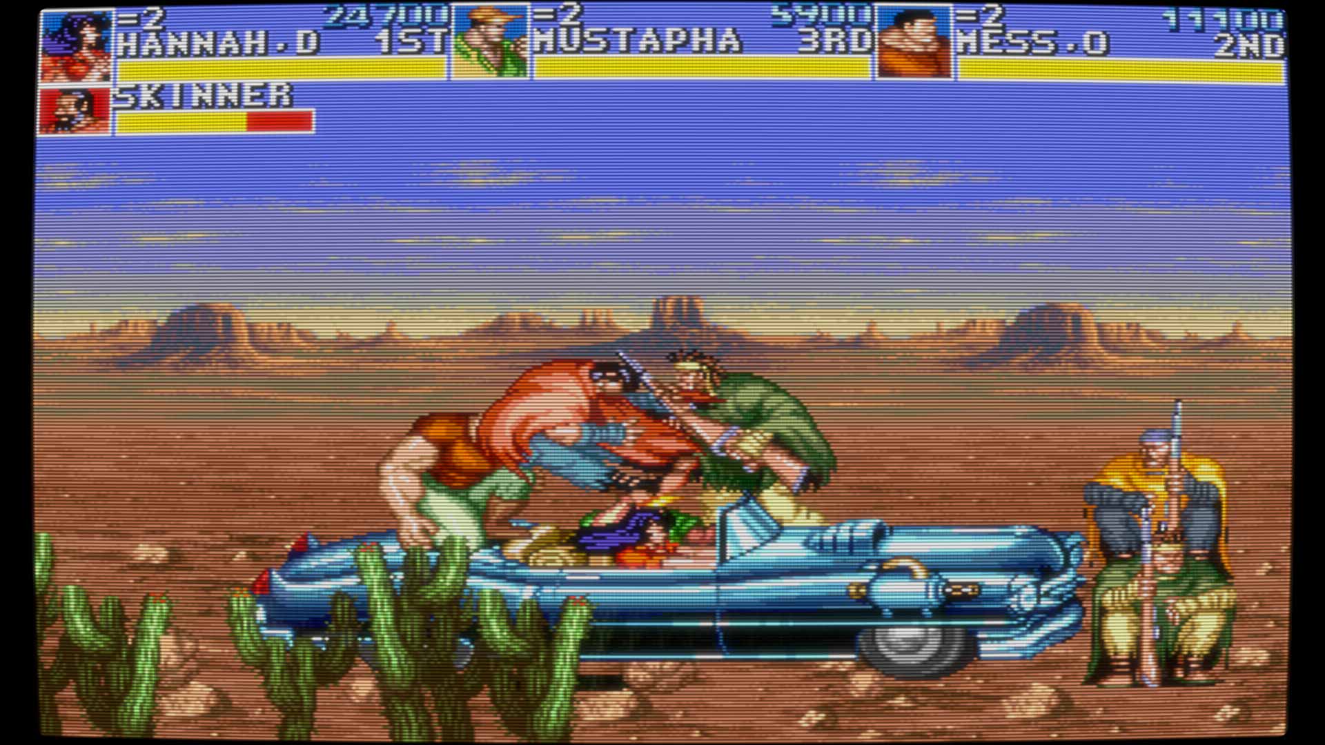 „Cadillacs and Dinosaurs“ orientiert sich am klassischen Beat-’em-Up-Formelbuch, verfeinert es aber mit einer Extraportion Dynamik und Wumms. Jeder der vier spielbaren Charaktere hat eigene Stärken, Movesets und Spezialangriffe: Jack ist der Allrounder, Mustapha flink und akrobatisch, Mess haut wie ein Güterzug, und Hannah kombiniert Technik mit Stil. Das gibt dem Spiel auch im Solo-Run einen hohen Wiederspielwert. Die Steuerung ist präzise und direkt: ein Button für Schläge, einer fürs Springen, beide kombiniert für den Special Move – alles sitzt sofort. Wer ein bisschen mit dem Timing spielt, kann Combos aneinanderreihen, Gegner greifen, werfen oder in Umgebungsobjekte schmettern.