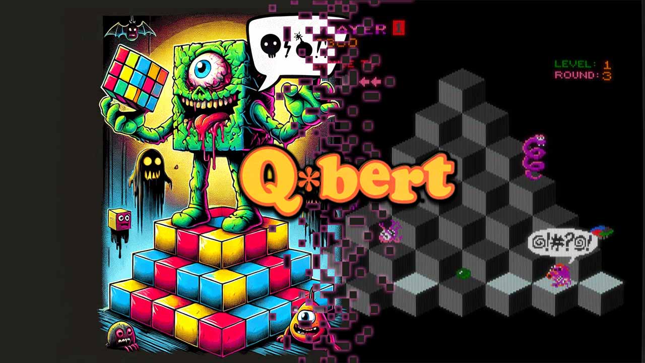 Die Grafik von Q*bert ist sehr minimalistisch und die pyramidenförmige Spielwelt nutzt die isometrische Perspektive, um die Illusion von Tiefe zu erzeugen. Die Farben sind lebendig und tragen dazu bei, das Spiel sofort erkennbar zu machen. Der ikonische Look der Spielfigur, mit seiner knolligen Nase und dem schlichten Design, macht Q*bert zu einer der unverwechselbarsten Arcade-Figuren. Auch der Soundtrack ist zwar minimal, aber die Soundeffekte sind Kult: Qberts Fluchen, dargestellt durch „@!#?@!“, sorgt auch heute noch für Schmunzler. Jeder Sprung hat einen passenden Soundeffekt, der das Gameplay dynamisch unterstützt.