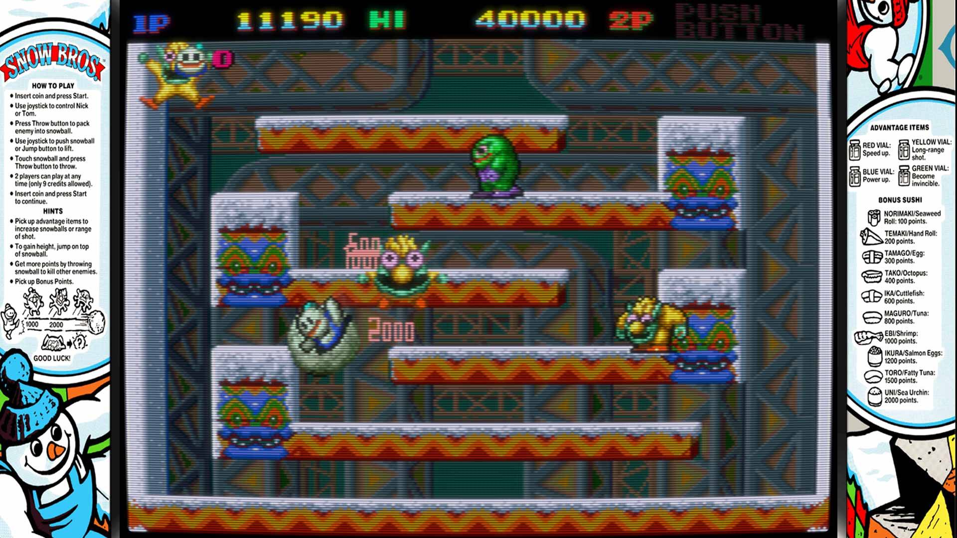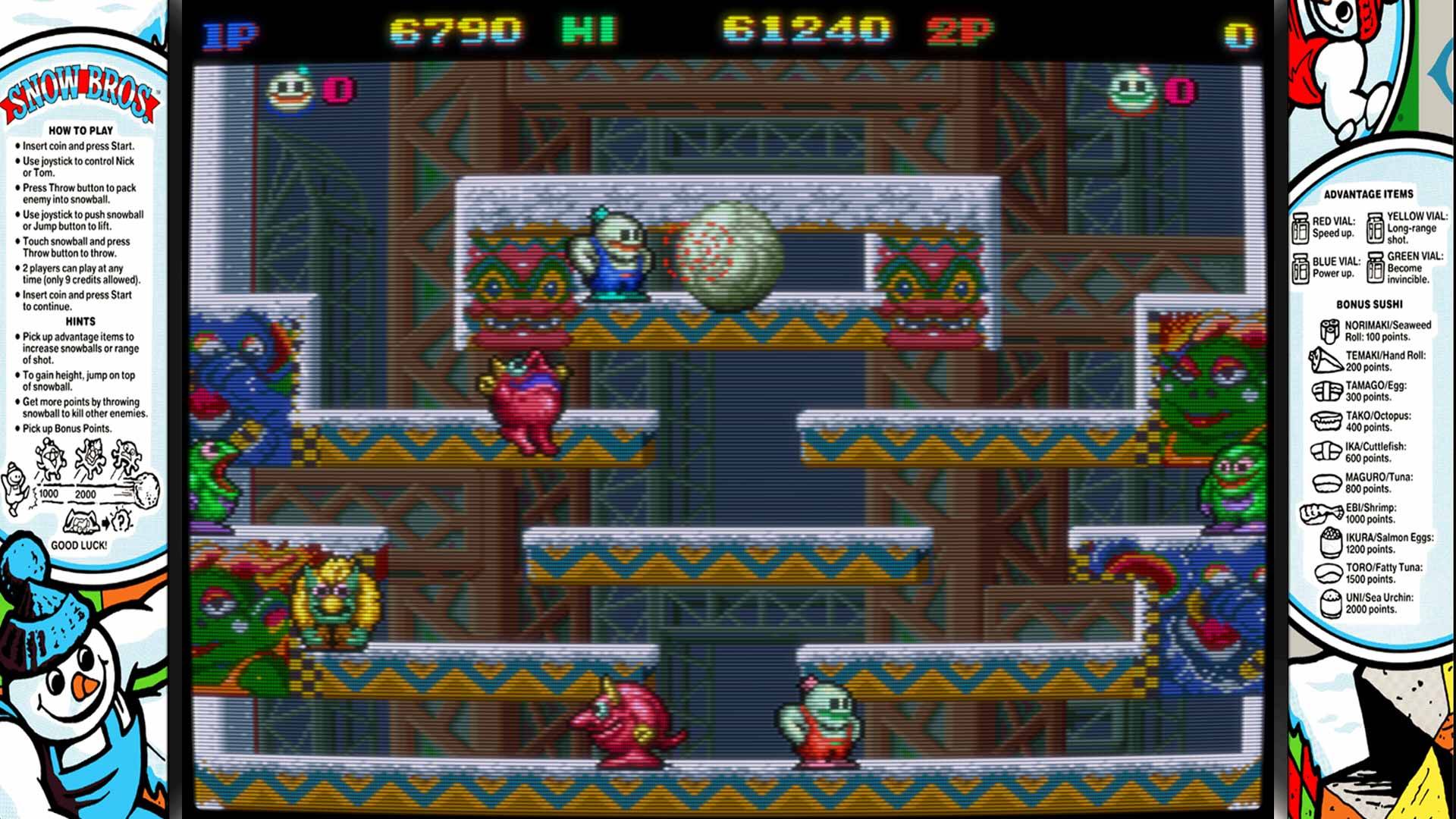 Snow Bros:. Nick & Tom, entwickelt von Toaplan, brachte seinen eigenen frostigen Twist mit in das Genre der Action-Puzzler: Gegner werden zu riesigen Schneebällen gerollt und in chaotischer Manier durch das Level geschossen. Das Ergebnis? Ein schnelles, süchtig machendes Gameplay mit hohem „Nur noch eine Runde!“-Faktor.
