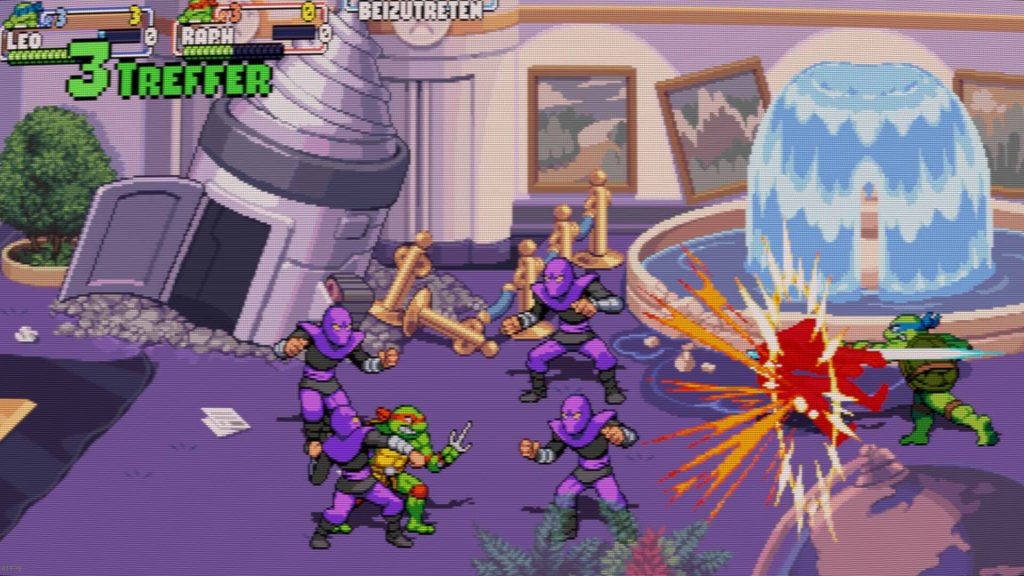 Die Pixelgrafik ist ein echter Hingucker und ein perfektes Beispiel dafür, wie Retro-Ästhetik mit modernen Designansätzen kombiniert werden kann. Tribute Games hat es geschafft, die klassischen Wurzeln einzufangen, während sie die visuelle Qualität auf ein neues Level heben. Jeder Turtle, aber auch Nebencharaktere und Bosse, wurden mit viel Liebe zum Detail animiert, die Animationen sind flüssig und vielfältig, von den kraftvollen Angriffen bis hin zu witzigen Idle-Animationen, die den Charakteren Persönlichkeit verleihen. Die Levels strotzen vor Details und bringen Abwechslung in jede Szene. Ob die Straßen von New York, das Neon-geschmückte Shopping-Center oder das chaotische Technodrom – jedes Setting hat seine eigene Farbpalette und thematische Gestaltung. Explosionen, Schläge und Spezialfähigkeiten werden durch beeindruckende visuelle Effekte hervorgehoben, die nostalgisch wirken, aber dennoch frisch und modern aussehen.