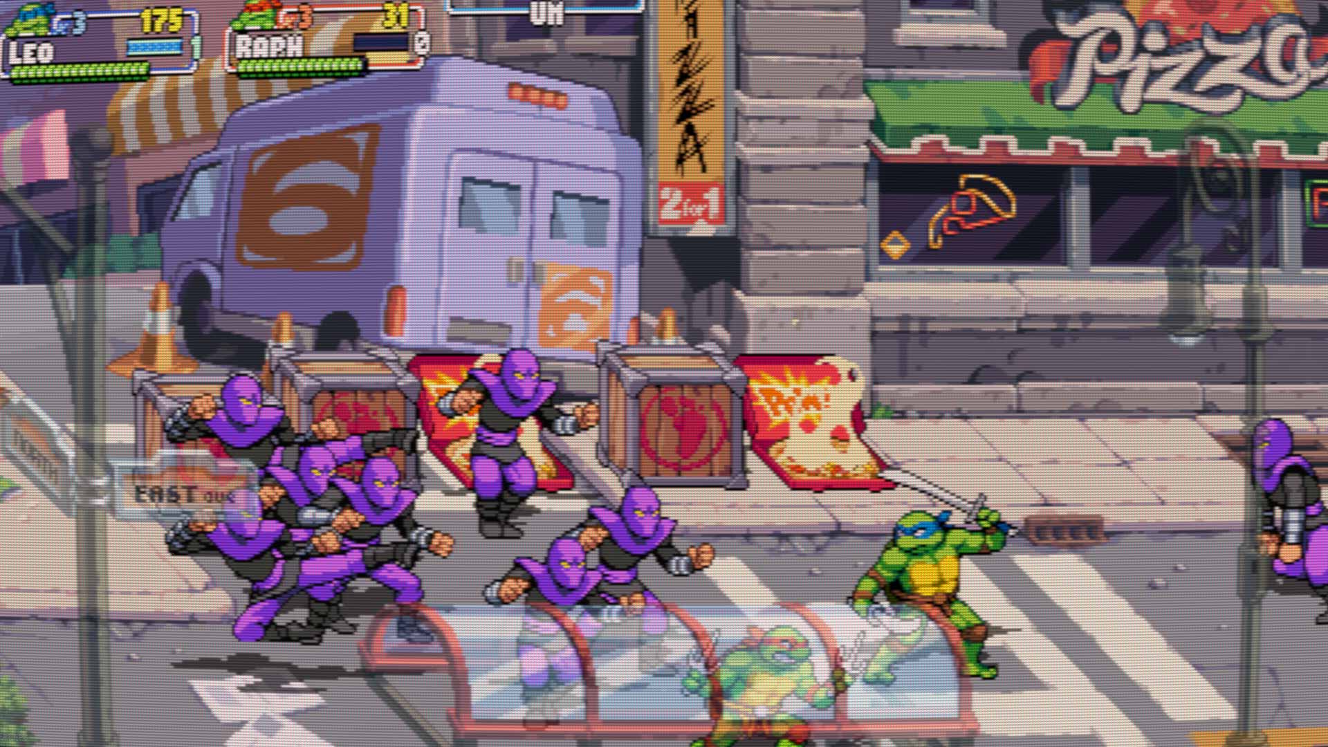 Die Pixelgrafik ist ein echter Hingucker und ein perfektes Beispiel dafür, wie Retro-Ästhetik mit modernen Designansätzen kombiniert werden kann. Tribute Games hat es geschafft, die klassischen Wurzeln einzufangen, während sie die visuelle Qualität auf ein neues Level heben. Jeder Turtle, aber auch Nebencharaktere und Bosse, wurden mit viel Liebe zum Detail animiert, die Animationen sind flüssig und vielfältig, von den kraftvollen Angriffen bis hin zu witzigen Idle-Animationen, die den Charakteren Persönlichkeit verleihen. Die Levels strotzen vor Details und bringen Abwechslung in jede Szene. Ob die Straßen von New York, das Neon-geschmückte Shopping-Center oder das chaotische Technodrom – jedes Setting hat seine eigene Farbpalette und thematische Gestaltung. Explosionen, Schläge und Spezialfähigkeiten werden durch beeindruckende visuelle Effekte hervorgehoben, die nostalgisch wirken, aber dennoch frisch und modern aussehen.